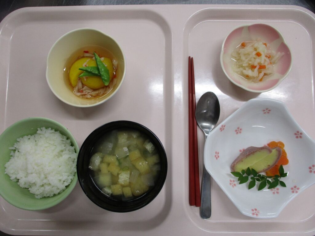 献立(紅白なます・オレンジ香るさつまロール・かぼちゃ饅頭のあんかけ・味噌汁)