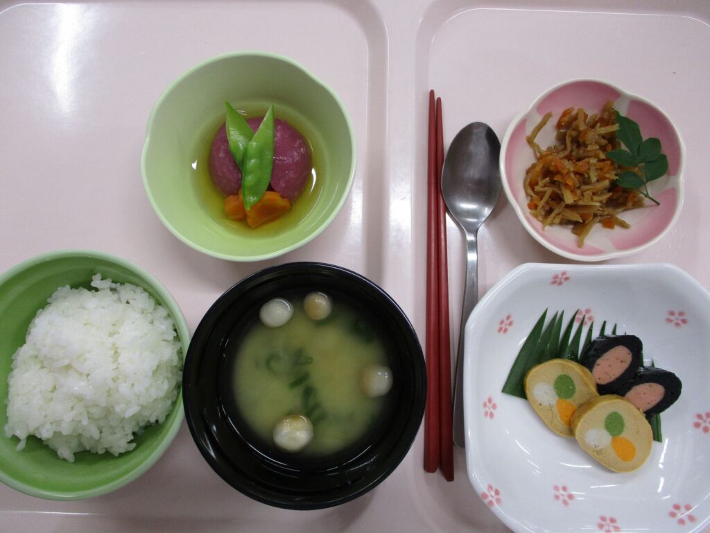 献立(さつま芋饅頭のあんかけ・鶏の柔らか三色巻・柔らか昆布巻き・きんぴらごぼう・味噌汁)